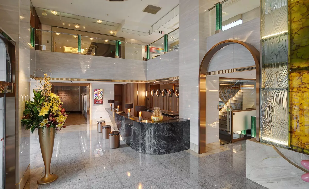 大器的七米挑高中庭,以白色系石材展现其风格,奢华吊灯在玻璃与不锈钢的混搭质材上,闪耀亮眼的光泽,加上匠心独具之玻璃雕塑,营造出一个闪耀水晶光芒的特有气氛。公共走廊空间设计,则延续主题的一致性,创造耳目一新的住宿体验。